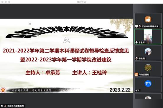 资深教师王桂玲作了题为《2021-2022学年第二学期本科课程试卷督导检查反馈意见暨2022-2023学年第一学期学院改进建议》的专题报告。王老师依据逼喱逼喱