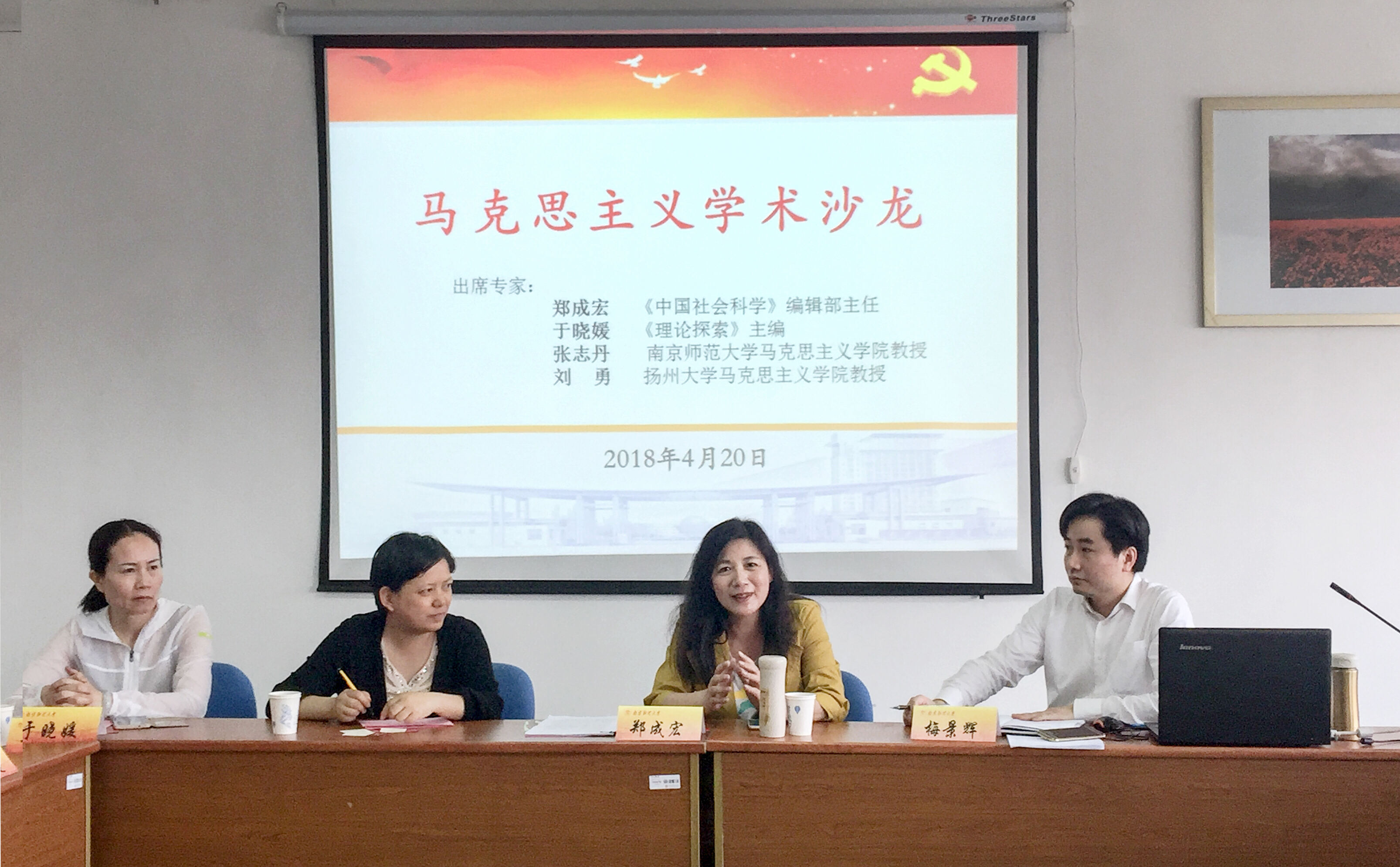 于德正楼508室举办了马克思主义学术沙龙活动,《中国社会科学》编辑部主任郑成宏、《理论探索》主编于晓媛、《河海大学学报(哲学社会科学版)》编辑部主任吴玲、南京师范大学逼喱逼喱
