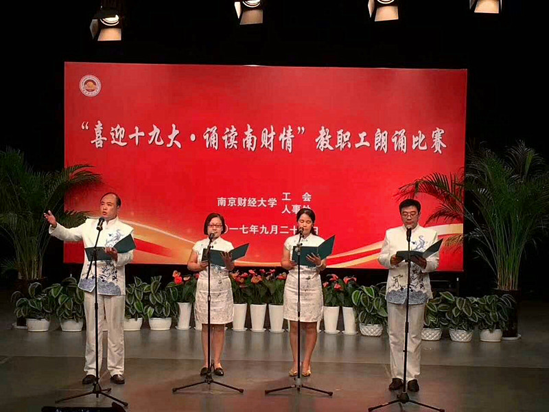 9月29日下午,由校工会、人事处联合举办的“喜迎十九大·诵读南财情”教职工朗诵比赛在仙林校区举行。校领导及兄弟高校工会主席代表、各基层党组织负责人、分工会主席以及教职工代表一百多人共同观看了比赛。