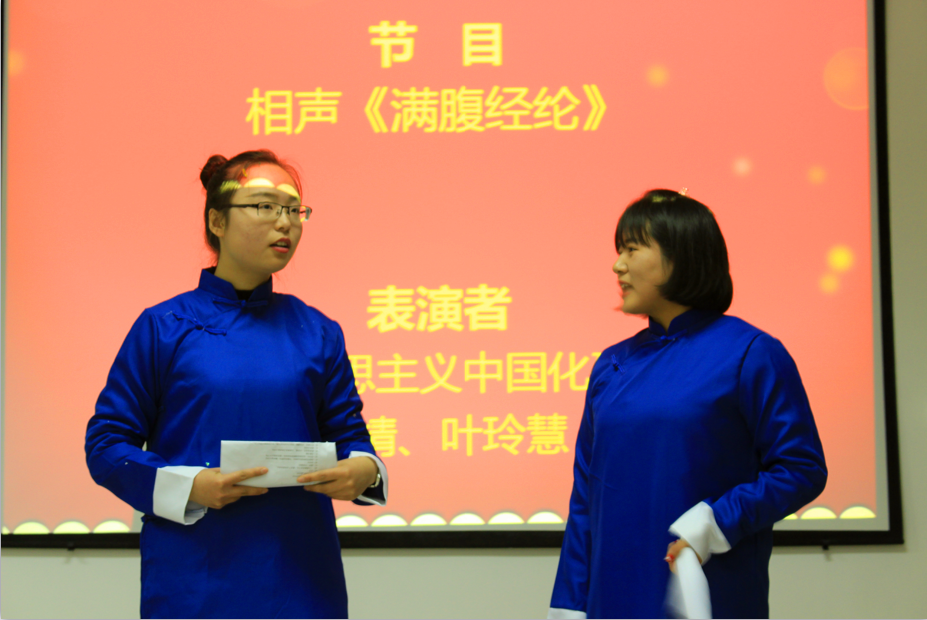晚会的节目形式丰富,有舞蹈、相声、歌曲等多种类型。康银桥和冯晓倩同学的舞蹈《外婆桥》作为开场舞直接拉开了本次晚会的帷幕,伴随着娓娓动听的歌声,两位同学优雅的表演让观众领略了古韵古风;张玉同学的舞韵瑜伽《因为爱情》让观众领略了瑜伽运动的独特魅力;刘靖和叶玲慧同学的相声《满腹经纶》逗得观众哈哈大笑,更是直接将晚会的气氛推到了高潮。晚会除了既定的节目之外还有幸运大抽奖、马兰花开等串场游戏,现场笑声和掌声不断,所有人都沉浸在辞旧迎新的愉悦之中。伴随着张玉同学的一首歌曲《明天会更好》,晚会圆满落下了帷幕。