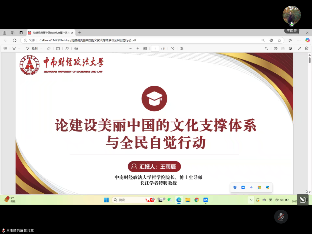 讲座分为两个阶段进行。第一阶段,王雨辰教授以“论建设美丽中国的文化支撑体系与全民自觉行动”的为题,从建设美丽中国的生态哲学文化基础、建设美丽中国的文化支撑体系的内涵和建设美丽中国转化为中国为全民自觉行动的路径与意义三个方面展开详细论述,强调美丽中国建设不仅需要有文化支撑体系的推动,更是全民自觉行动的要求。