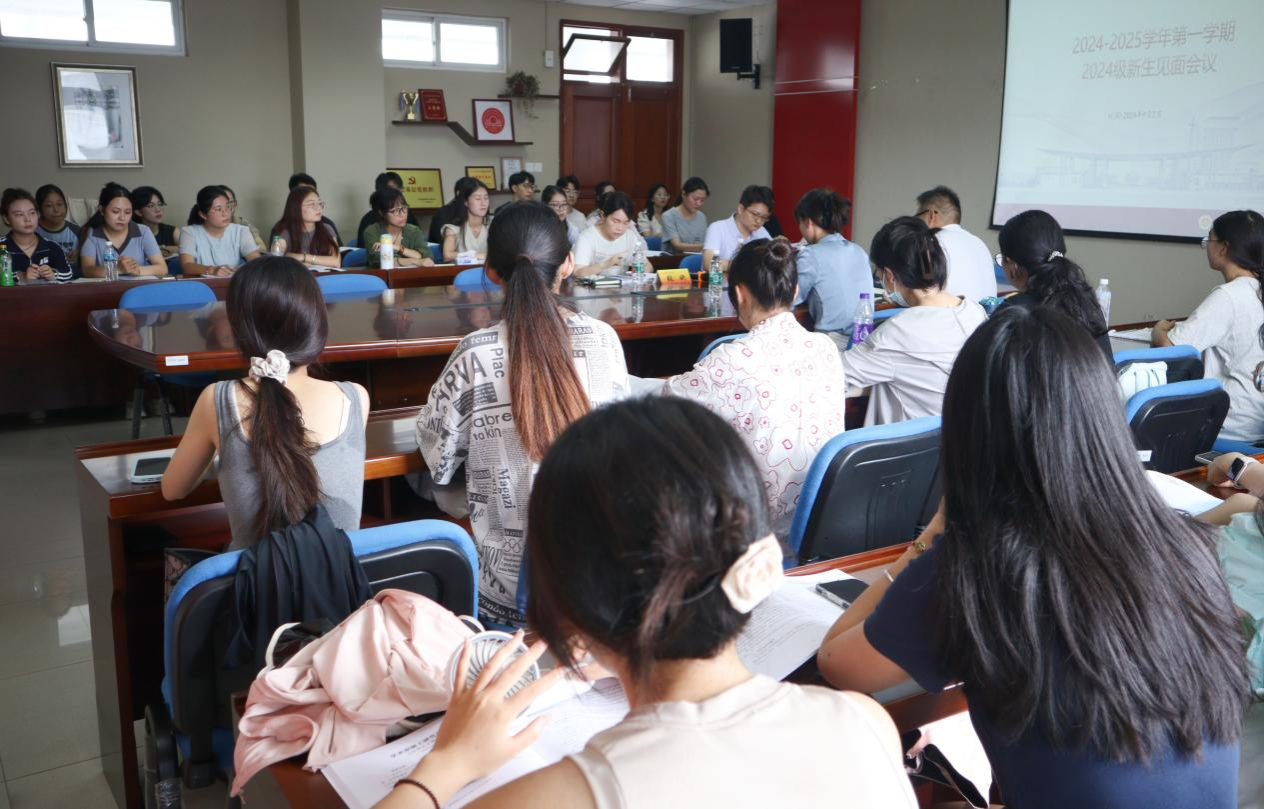 在德正楼508会议室召开2024级研究生培养规章制度与学术道德规范会议,学院院长助理范渊凯、研究生辅导员王晶、研究生秘书张妍以及逼喱逼喱