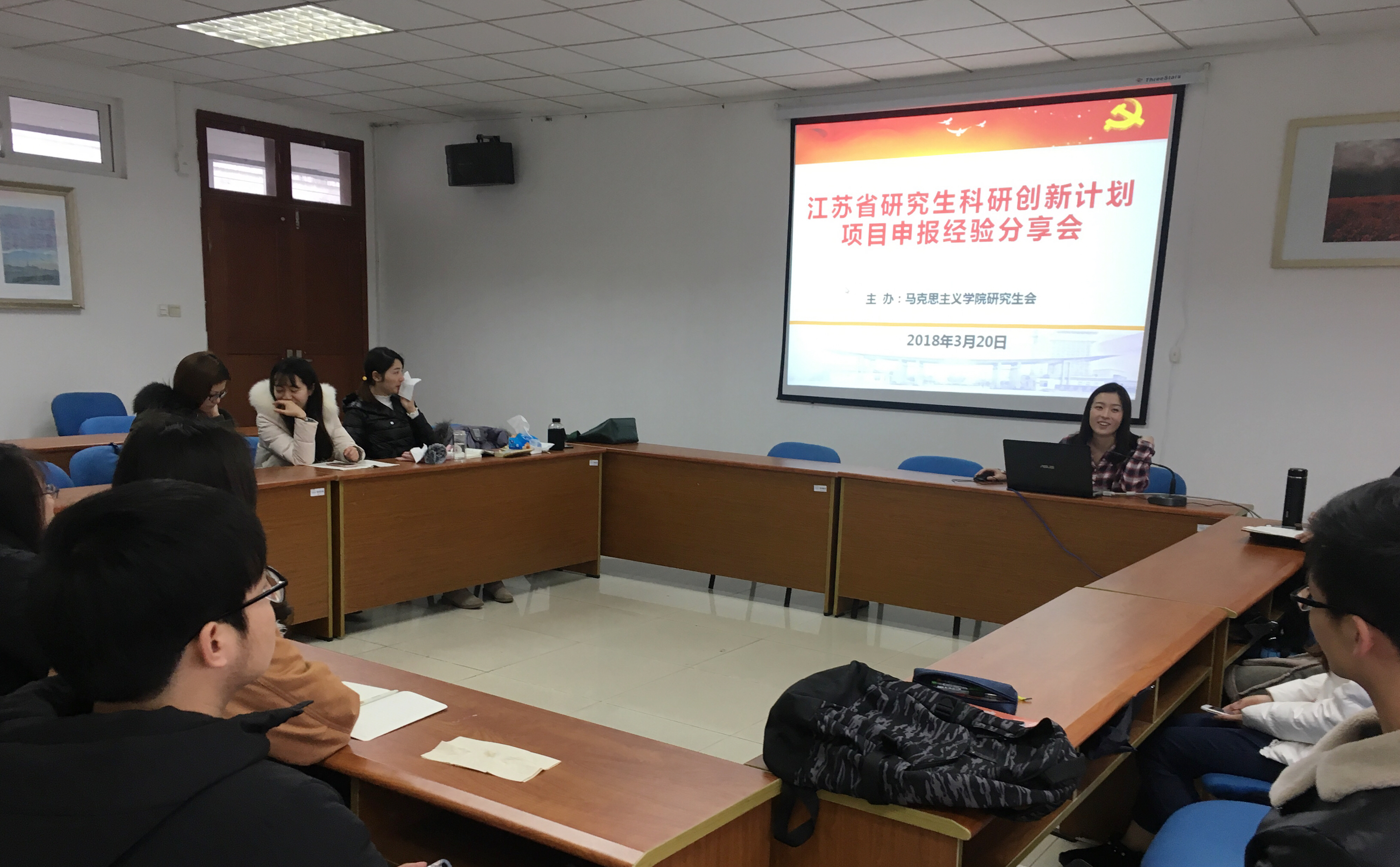 于学院会议室举办了“2018年度江苏省研究生科研创新计划项目”申报经验分享会。会议邀请2016级成功申报省立省助项目的莫菲、彭见欢、彭婷、屈文锦四位同学担任主讲,2017级意向申报省级课题的同学参加了会议,会议由逼喱逼喱